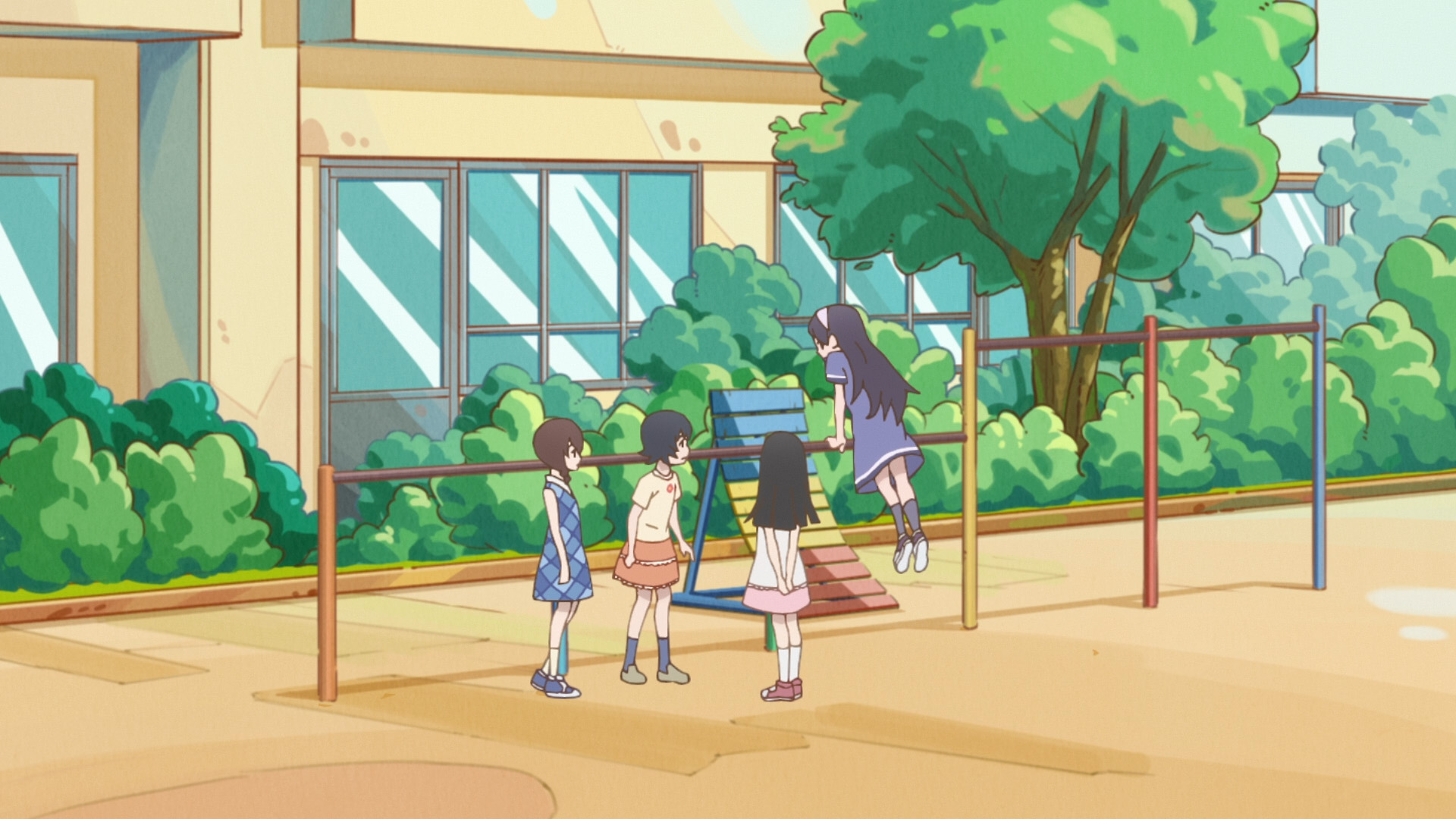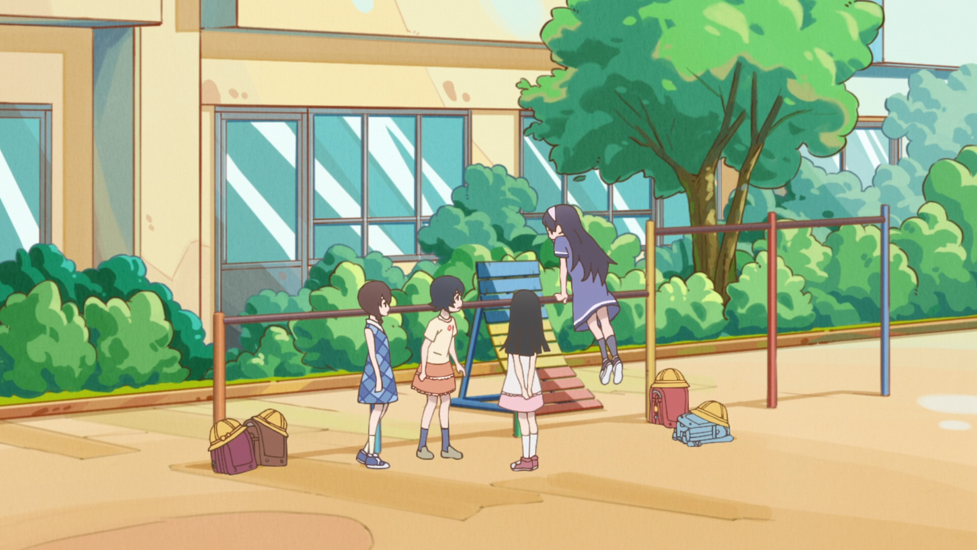 鉄棒付近に置かれていたランドセルが削除(原作は下校途中なので TV 版はそれに合わせたが、劇場版では休み時間という設定か?) |
