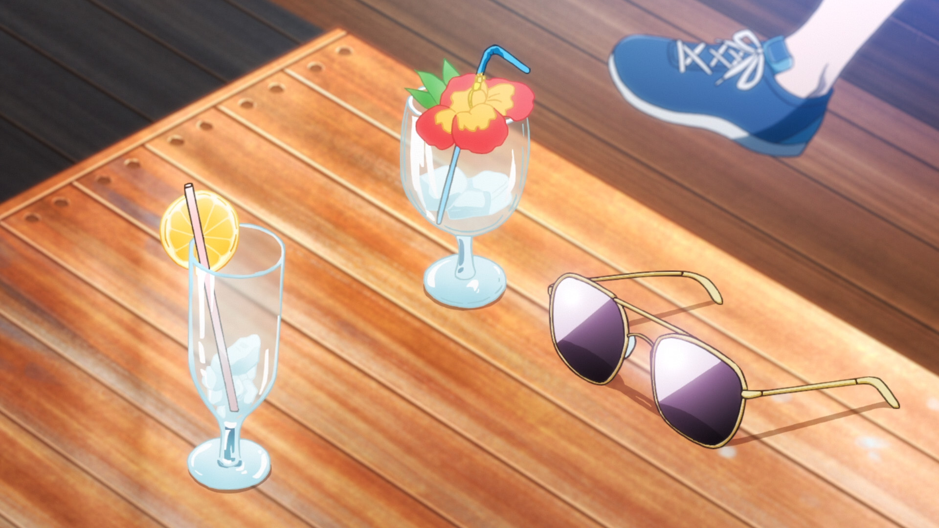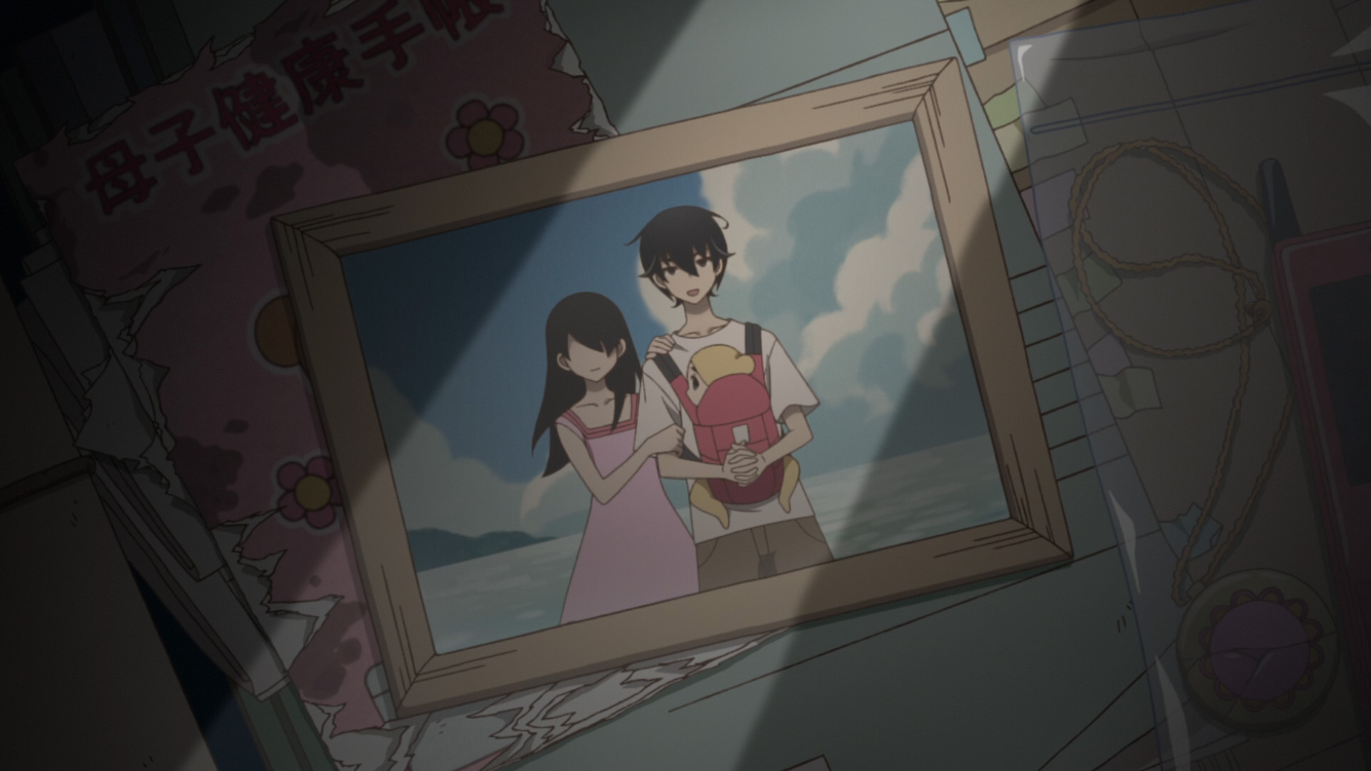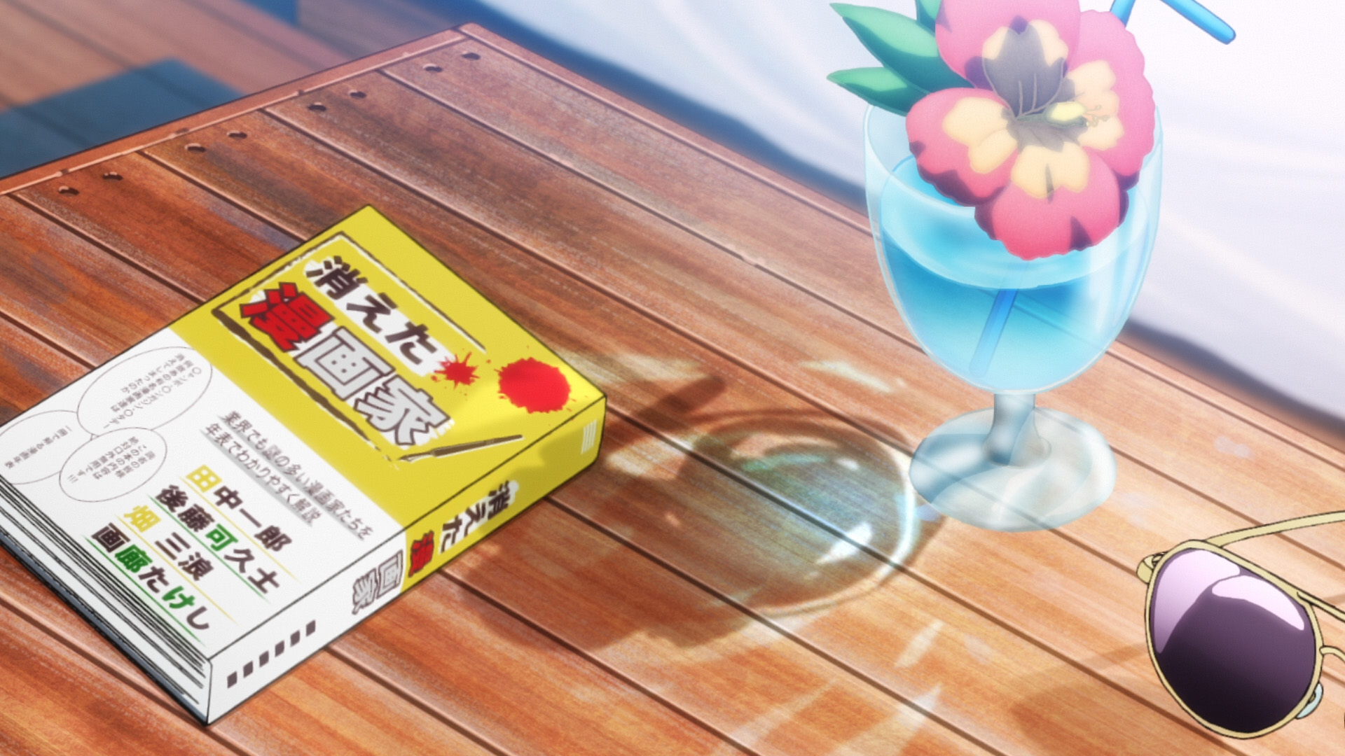 絵コンテには8話Bパート(18歳編)で使用された逗子マリーナの写真が貼られているが、実際はテーブル上の小物を写した構図になっている(TV 版10話の同カットを意識して描き直されているが、「消えた漫画家」の本が置かれるなどの変更点がある) |