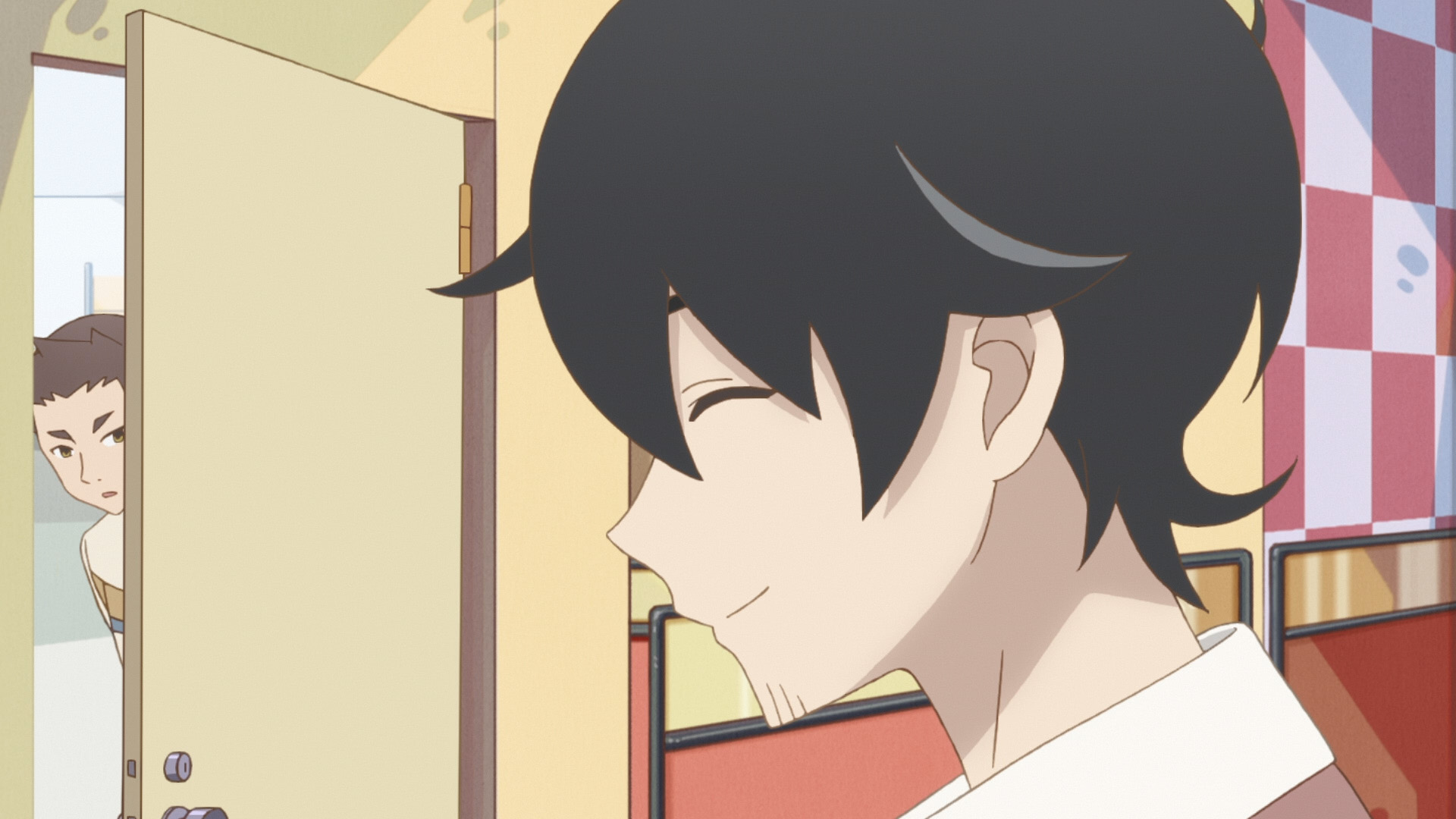テーブル上の小物が変更(「消えた漫画家」の本が追加、ドリンクが TV 版は空に対して劇場版は満杯) |