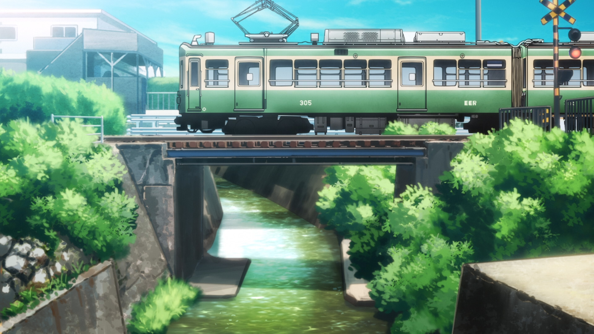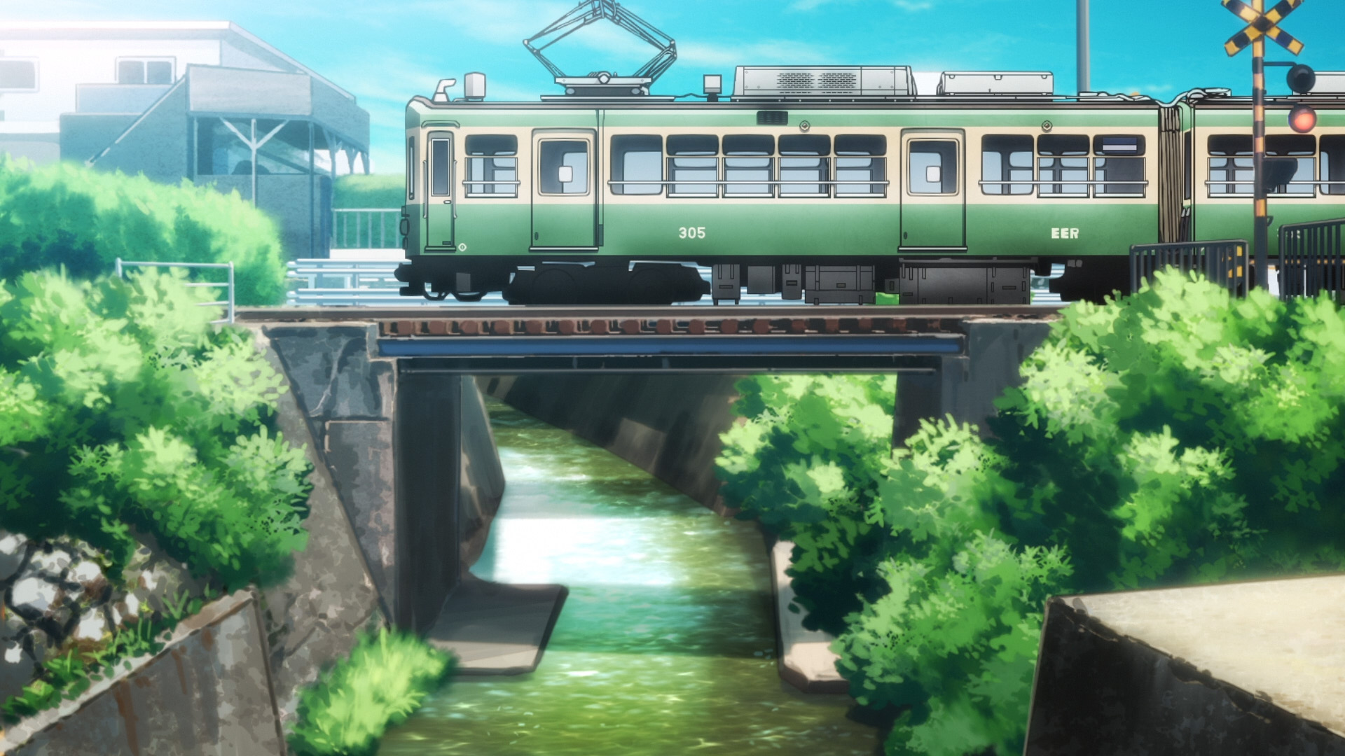 1話アバン(18歳編)のカットを流用しているが、線路の橋の右側の草が江ノ電の車両の手前に来るようになった(明らかに不自然で編集ミスと思われる) |