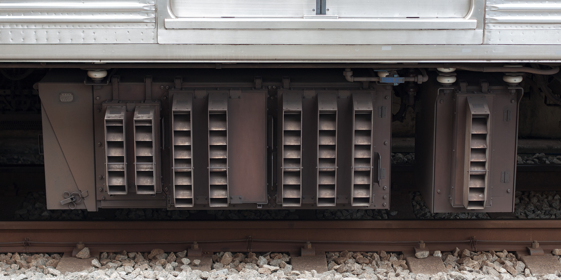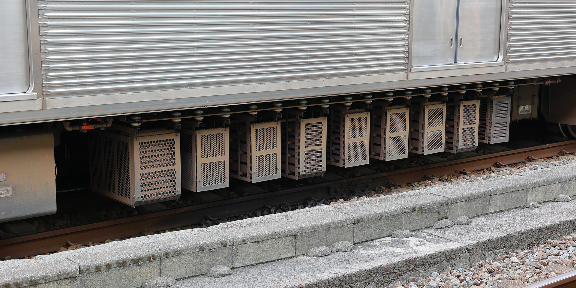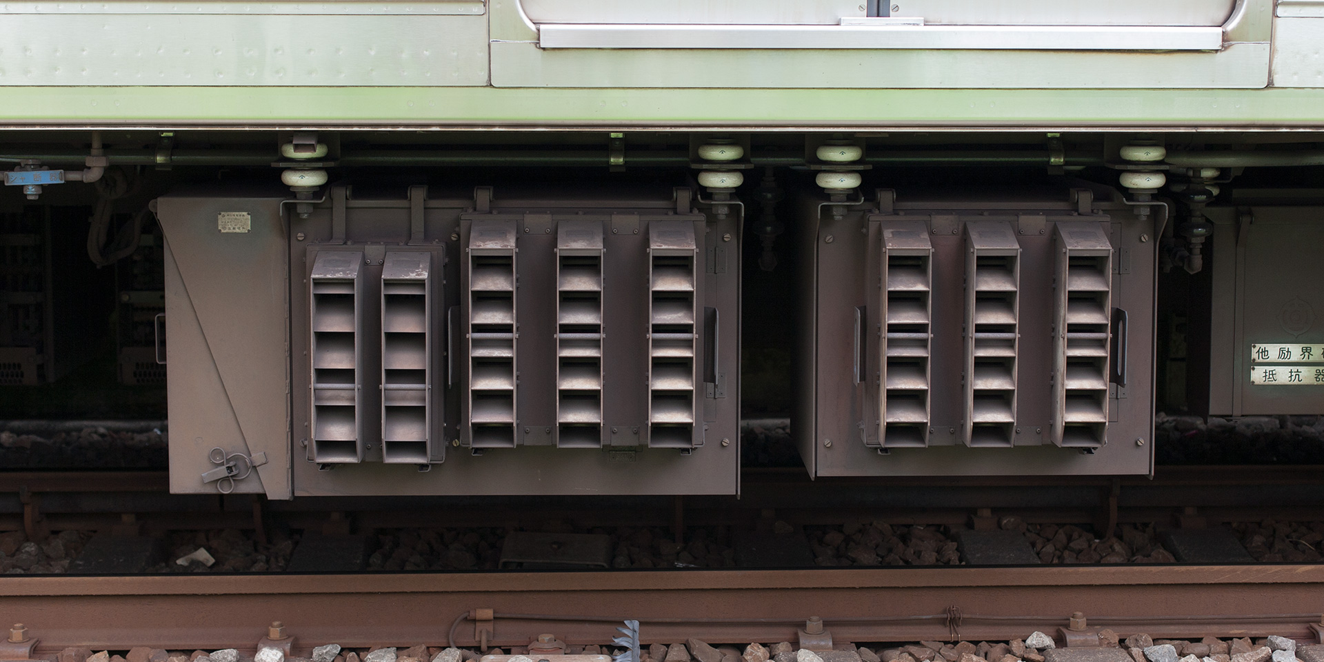 主制御器も専用の MMC-HTR-10D 型となりましたが、外観はユニット車用の MMC-HTR-20F 型と変わりません。しかし車両山側に目を向けると主抵抗器はユニット車の8個に対して7個と少なくなっており、抵抗器群のもっとも上り方にあるやや大きめの限流抵抗器との間が歯抜けになっている違いがあります。