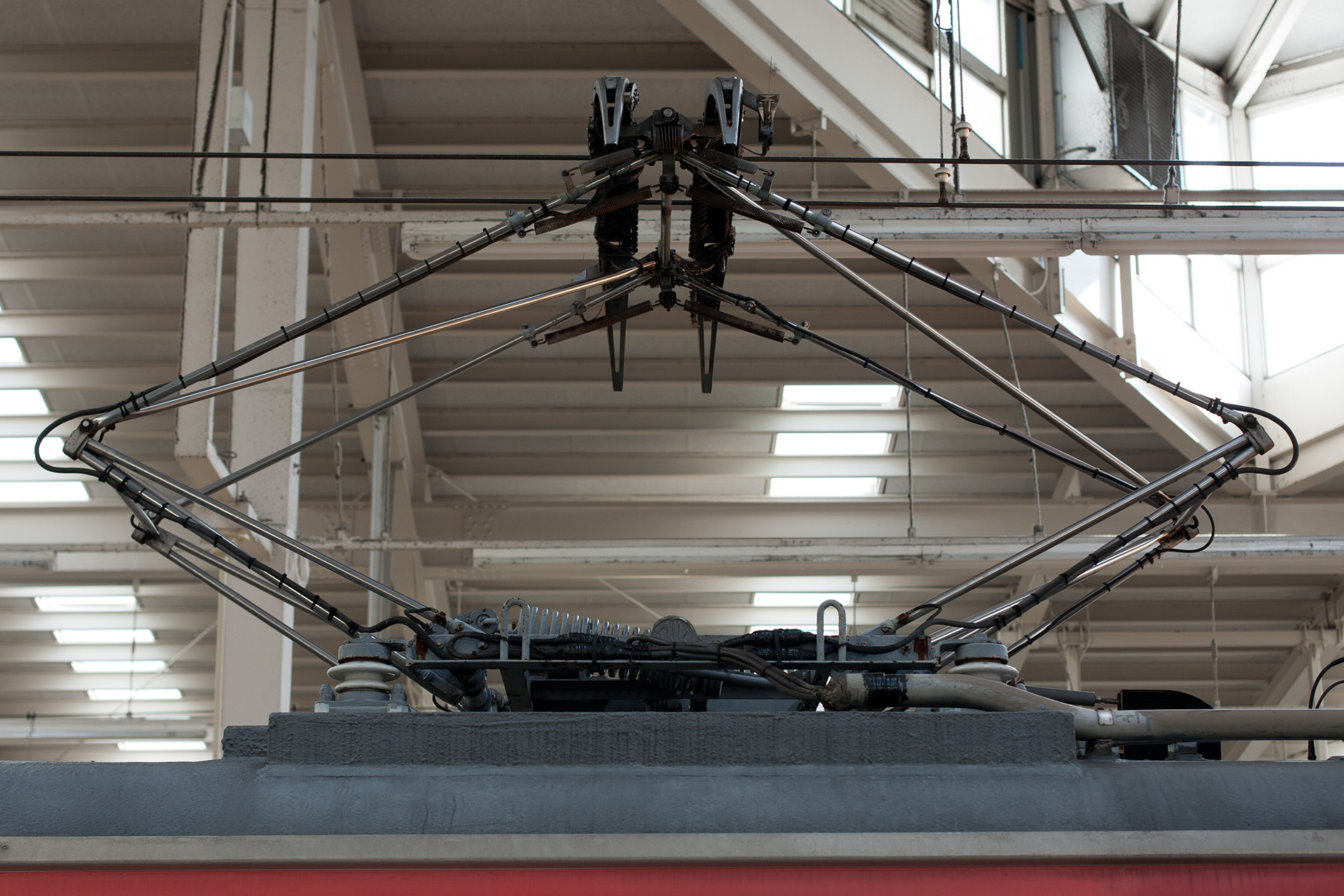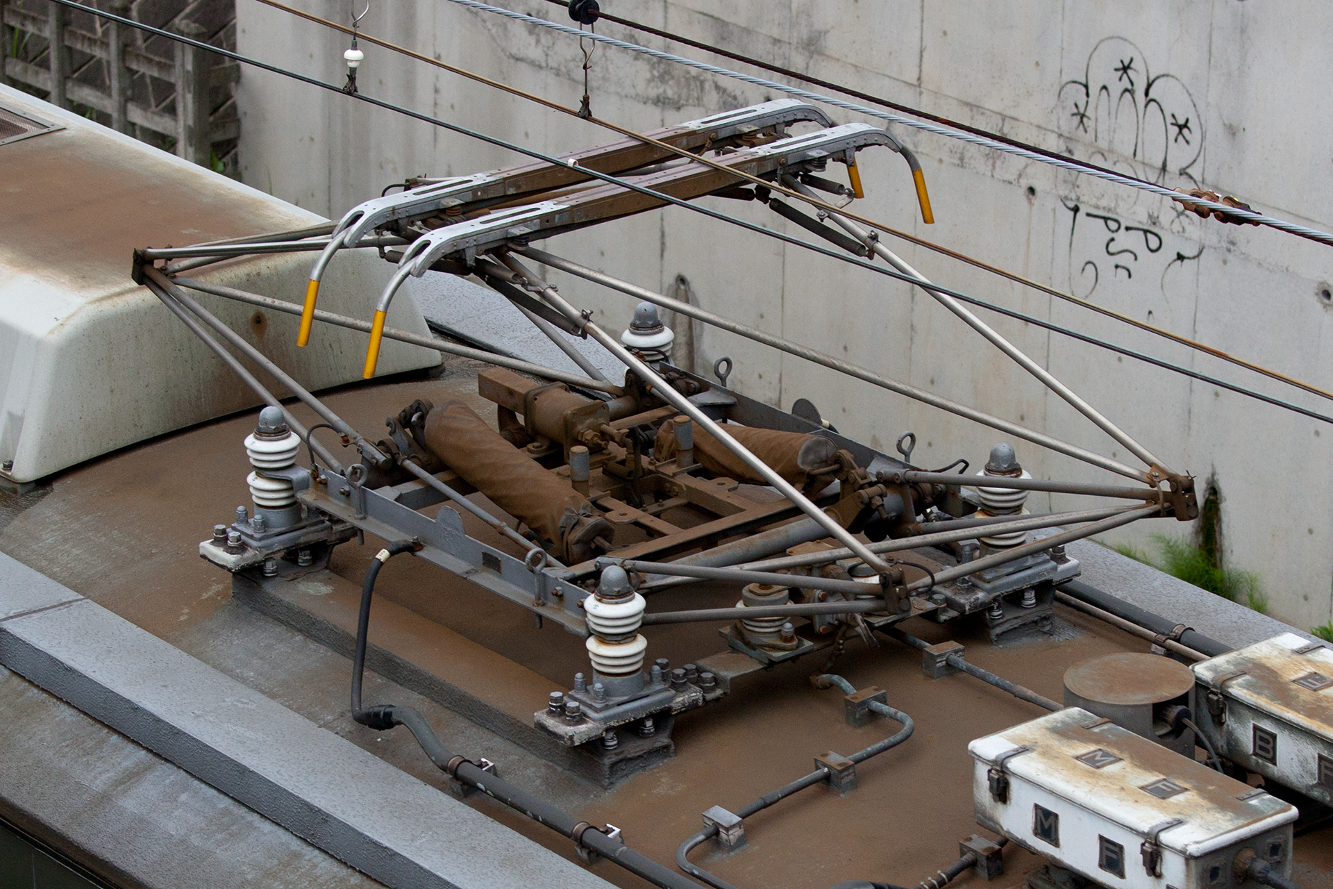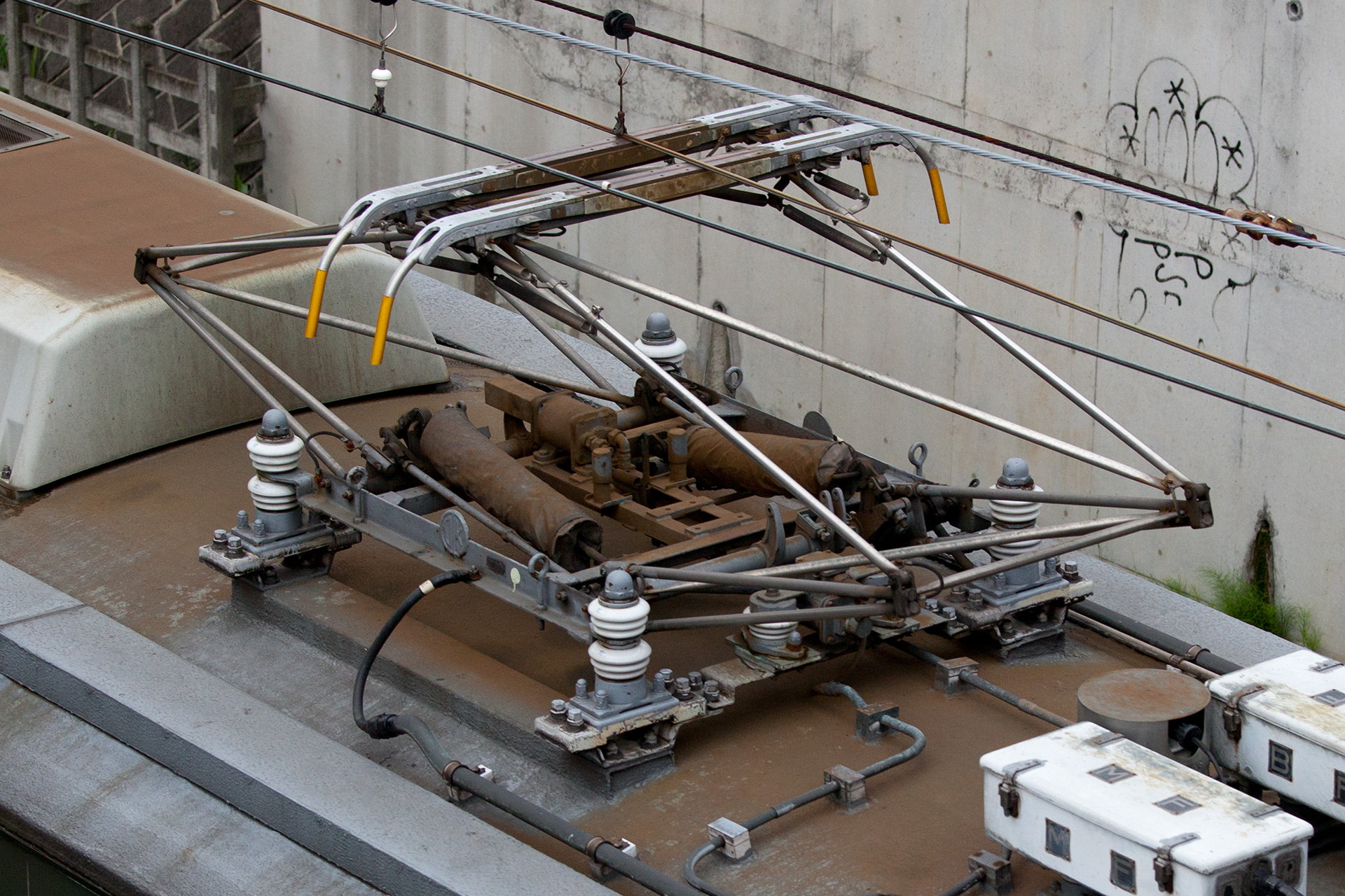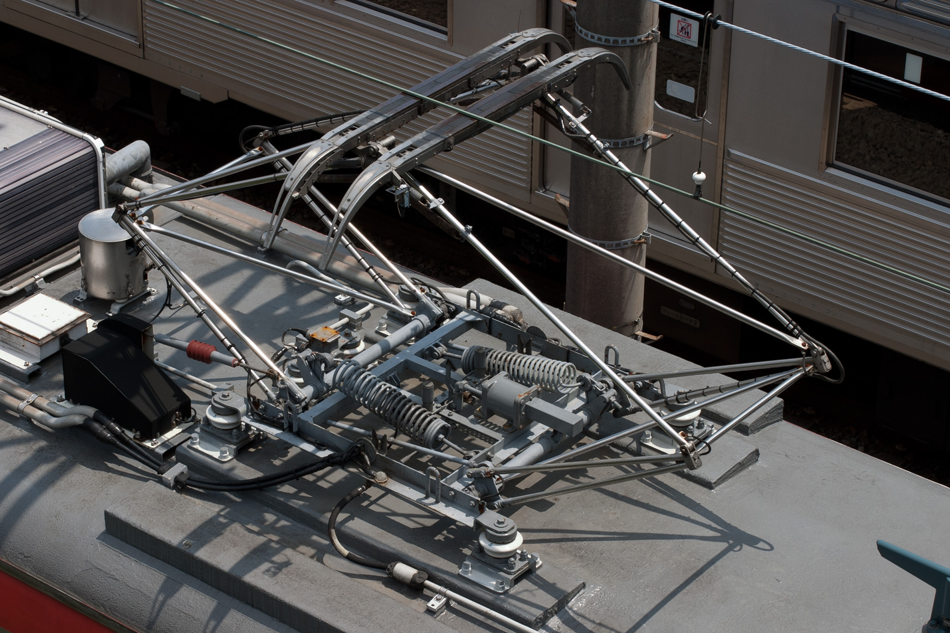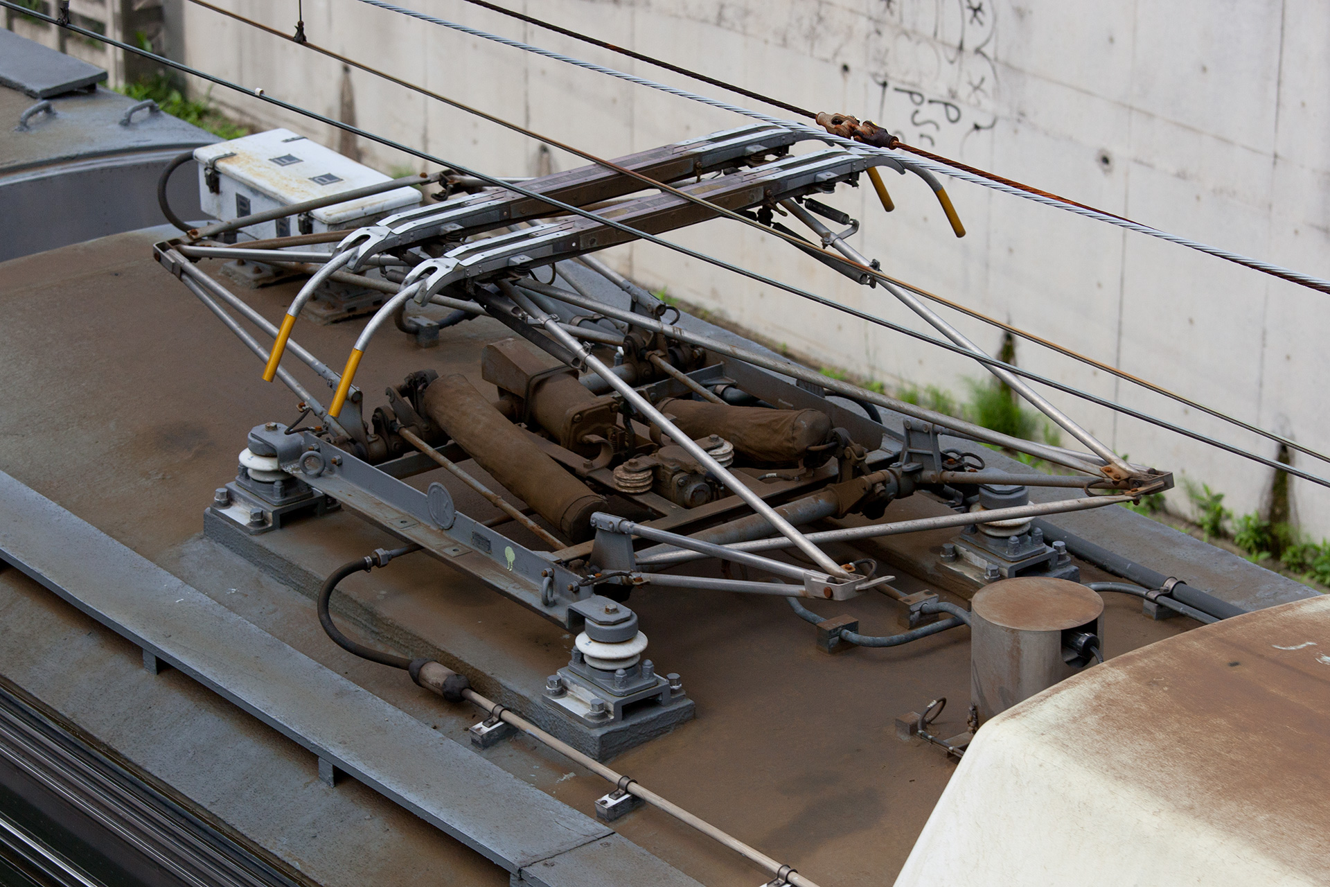 2丁パンタ車であるデハ7681、デハ7682のみにみられる特徴として、下り方の個体のみ、避雷器がある側の上枠と下枠の間接部同士を繋ぐ横控管(枕木方向)がありません。