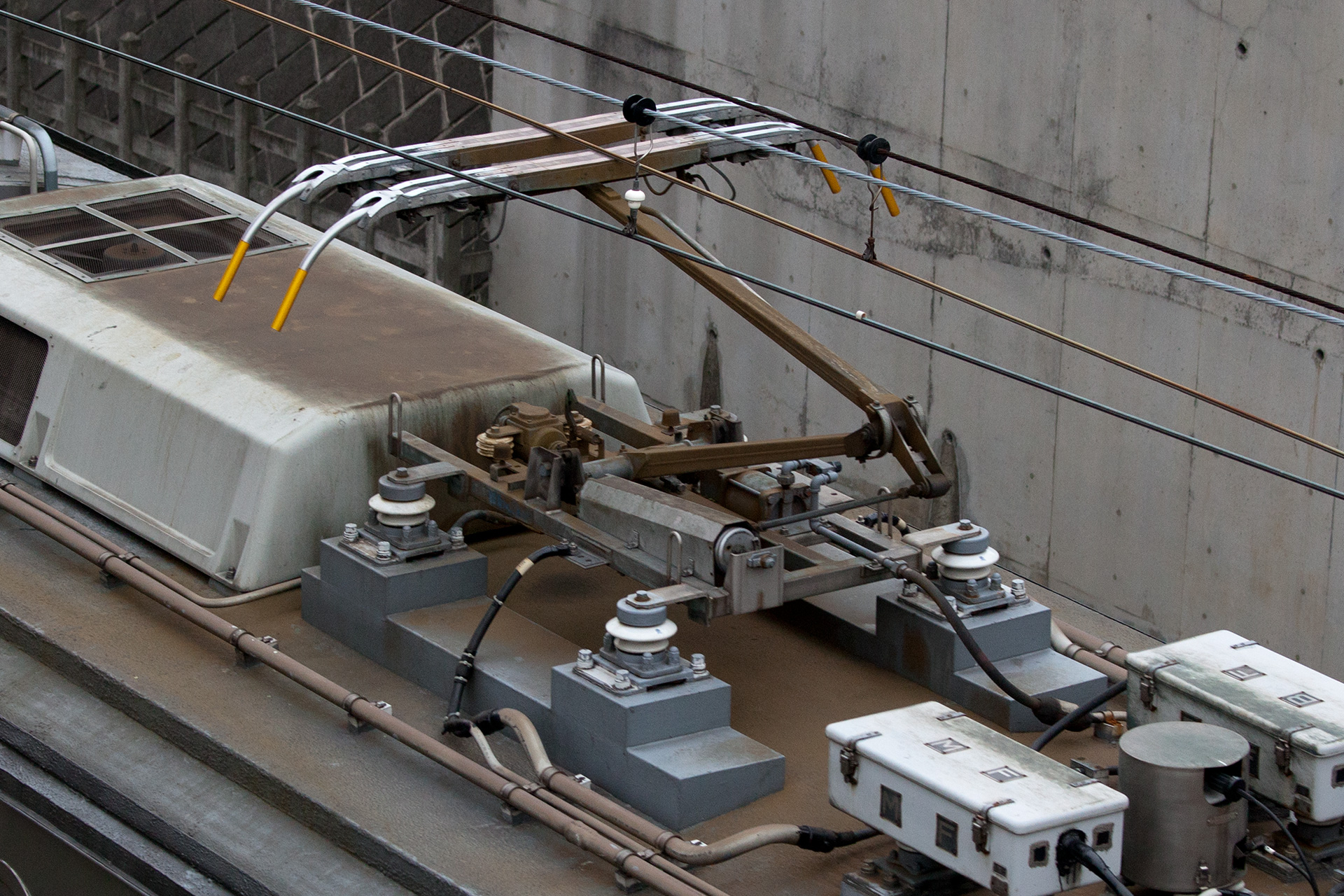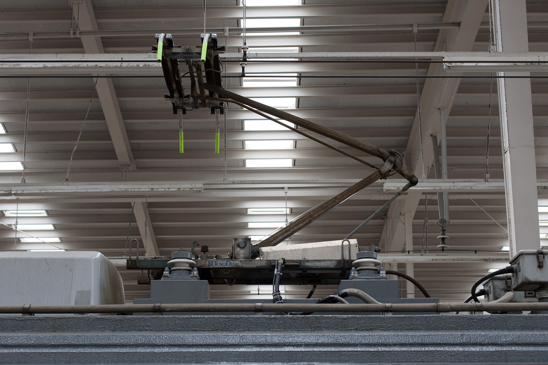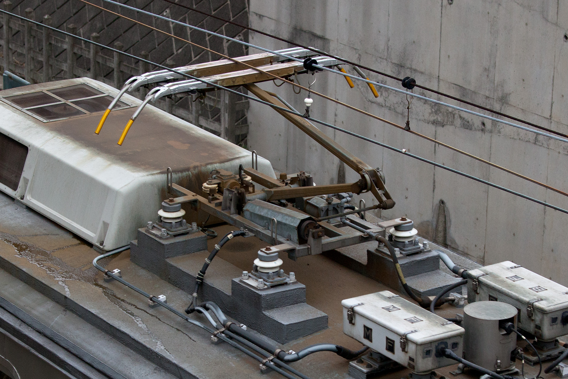 7200系3次車の一部と4次車からは台枠取付部の絶縁碍子が少なくなりました(リンク先写真はデヤ7290上り方、PT43型)。デヤ7200、デヤ7290は特殊車への改造にあたりパンタグラフが増設されていますが、それらも少ないタイプとなっています。