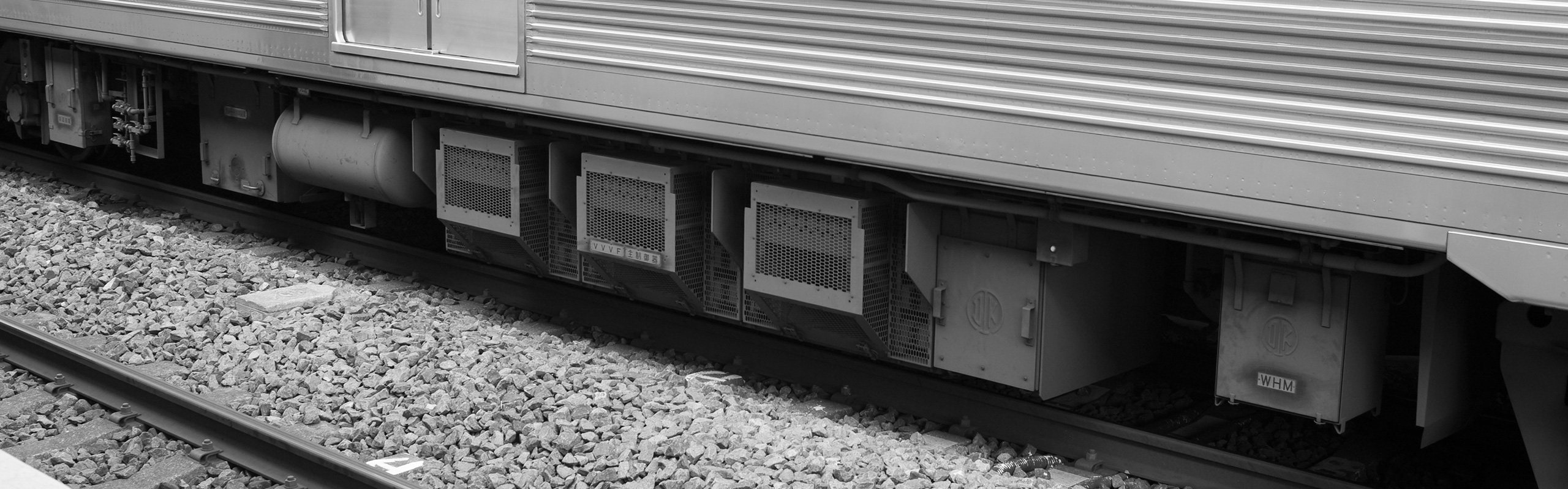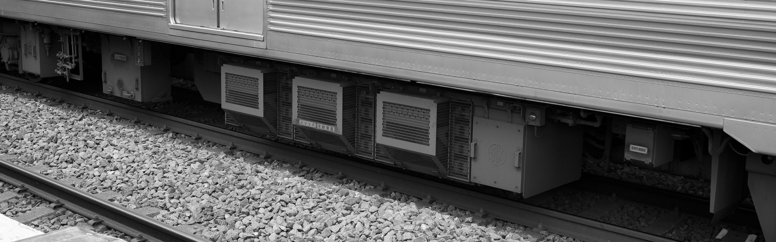 主な機器は下り方から順に、ブレーキ受量器、VVVF断流器、VVVF継電器、接地開閉器、VVVFフィルタリアクトル、空気圧縮機(HS-20型)です。